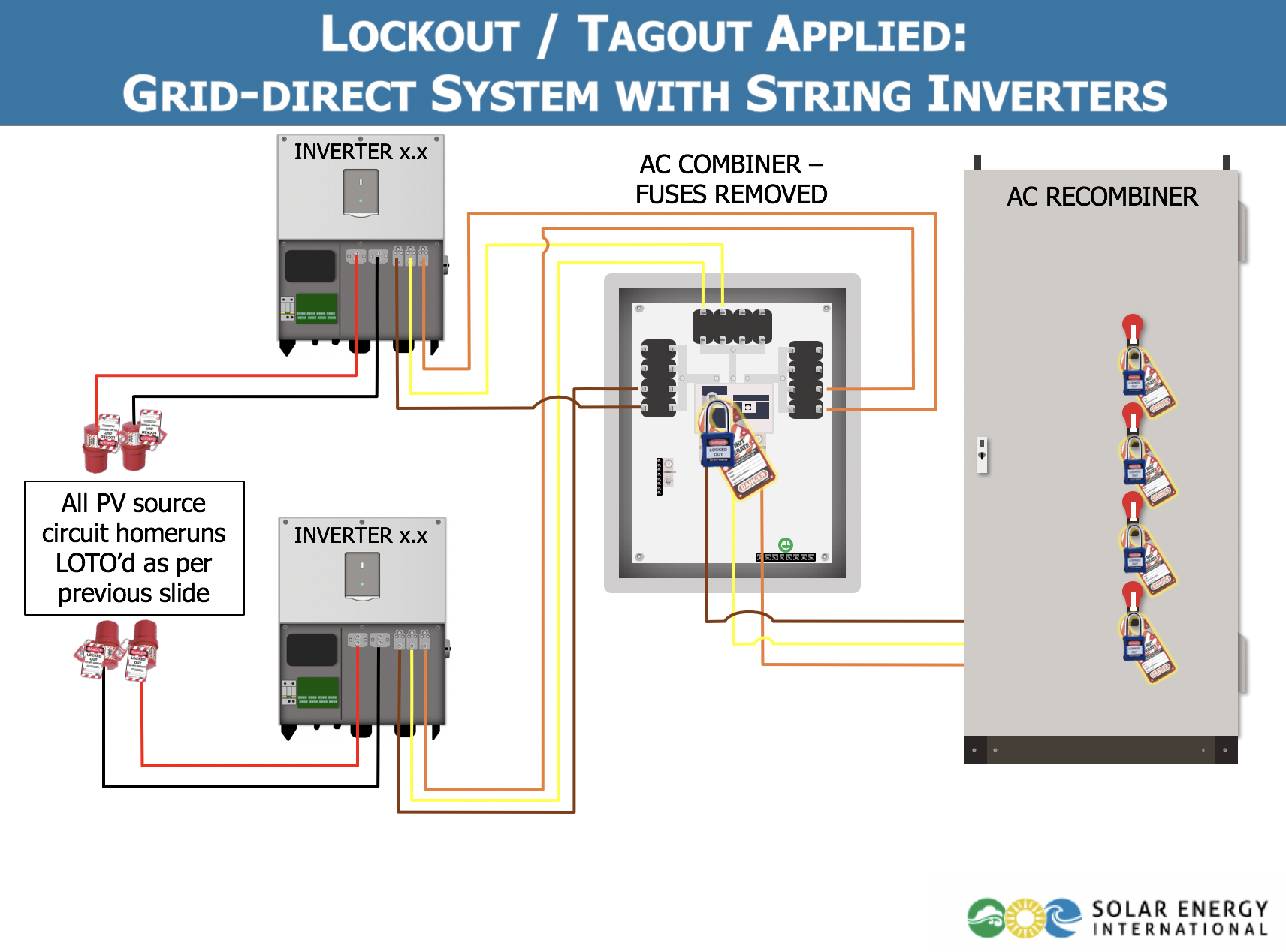 • Lesson 2: Electrical Hazards- Determine electrical hazards on large-scale PV job sites, identify shock and arc flash hazards and implement protective measures, define lockout/tagout methods and principles, examine installation, maintenance, and PV testing hazards.